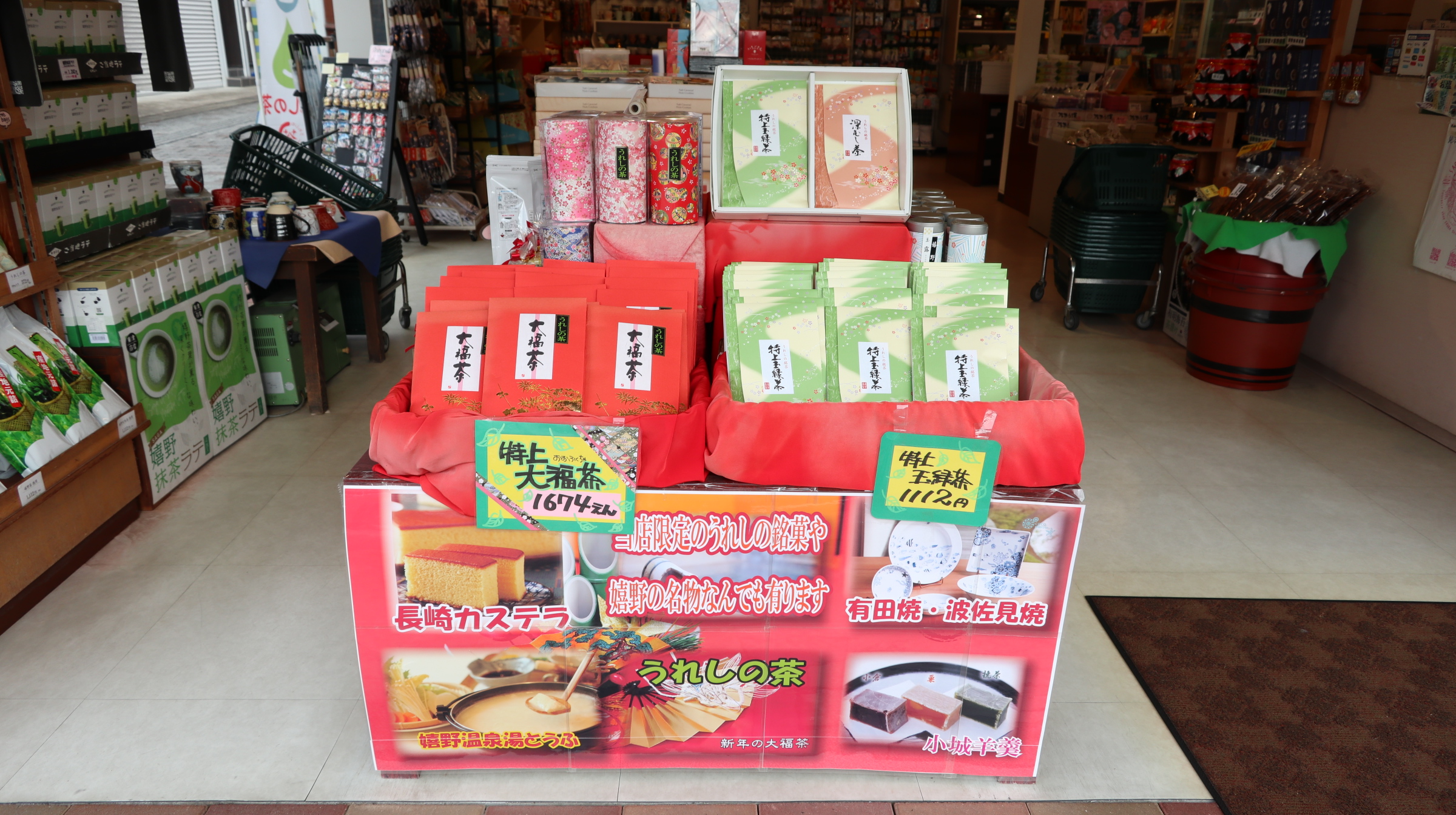 来店客の約8割は観光客で、旅の思い出として購入する人も多い。また、嬉野茶を使った茶のりや蕎麦やお菓子など、自社オリジナル商品も充実。来店時には自社製造の嬉野茶を試飲しながら、ゆっくりと買い物を楽しむことができる。全国発送にも対応しており、帰宅後に改めて佐賀の味を楽しんだり、贈り物として利用したりする人も少なくない。店舗は足湯広場の目の前に位置し、足湯を楽しむ人へ試飲を配るなど、街とのつながりも大切にしている。向かいにあるイートインスペース「温泉街道 輪来」とともに完全オープンスペースとなっており、どちらの店舗にもドアはない。